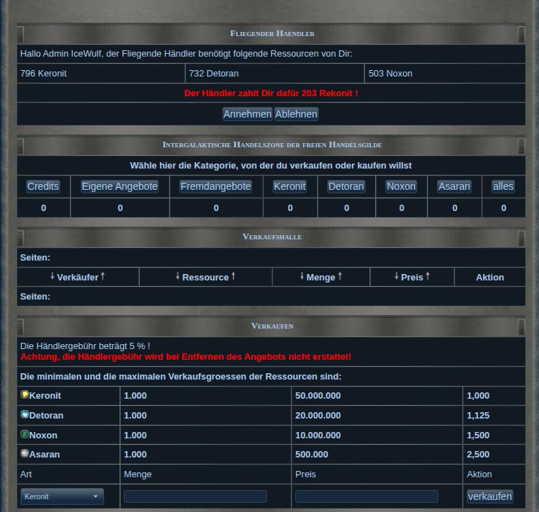 In der Handelszone könnt Ihr zum jetzigen Zeitpunkt verschiedene Ressourcen verkaufen oder kaufen. Auch kommt von Zeit zu Zeit ein Händler vorbei, der Euch dann ein Angebot macht. Ihr könnt das dann annehmen oder verwerfen. Der Händler kommt 3 Mal pro Tag.